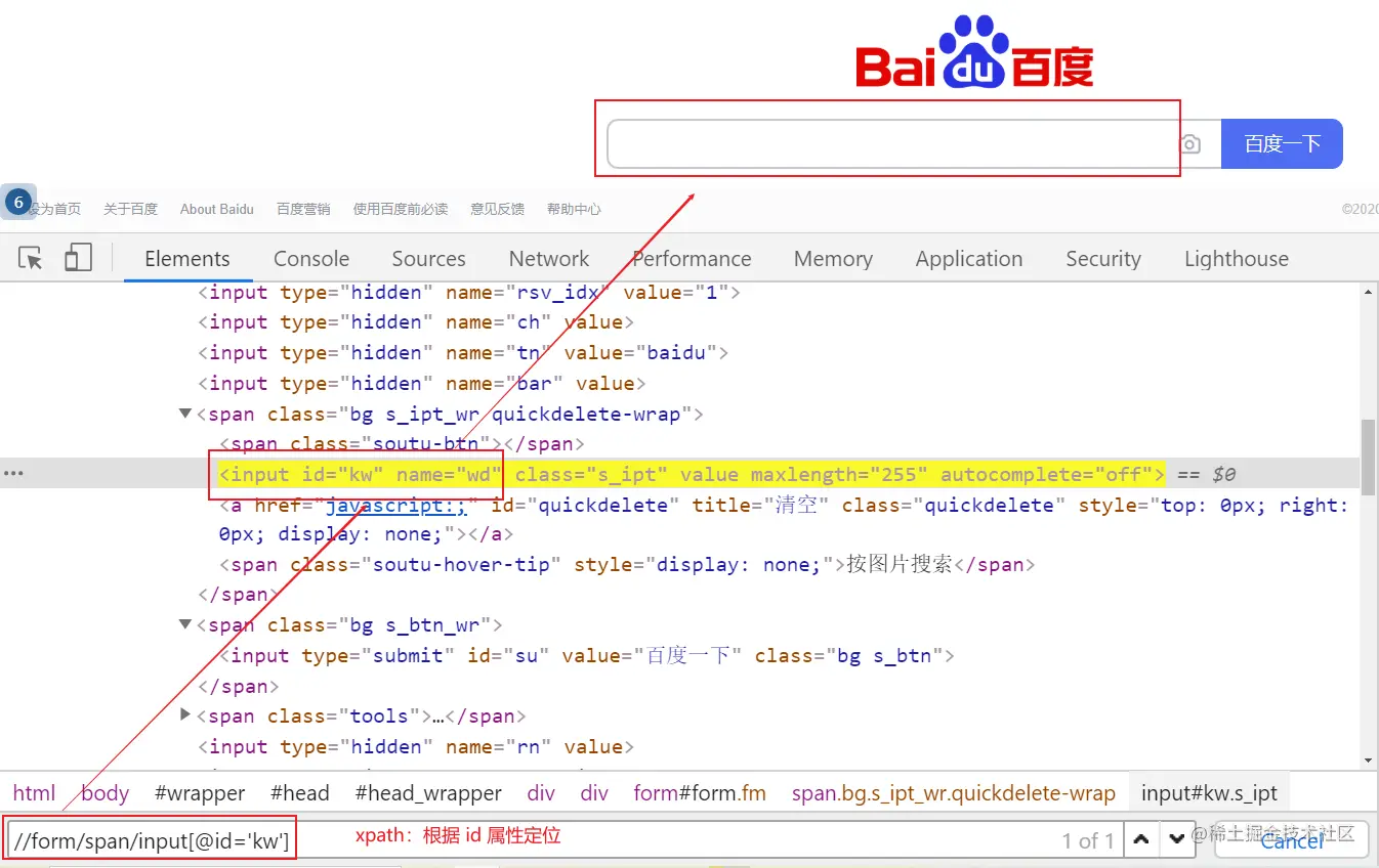 element = driver.find_element_by_xpath("//div/form/span/input[@id='kw']") # 根据 id 属性 定位元素