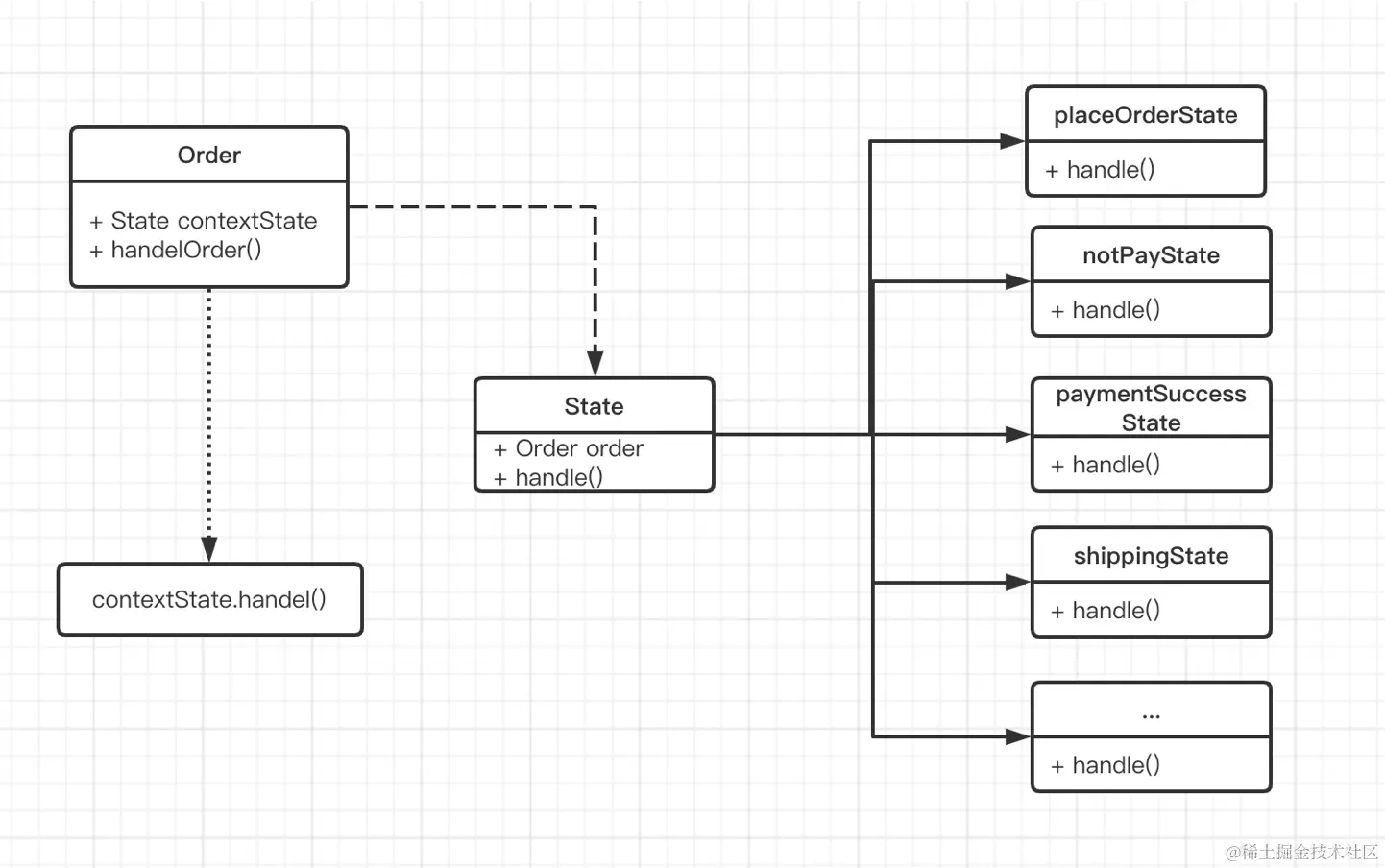 Order:订单对象,使用contextState对象进行状态的切换。handelOrder中调用状态对象的handel方法。