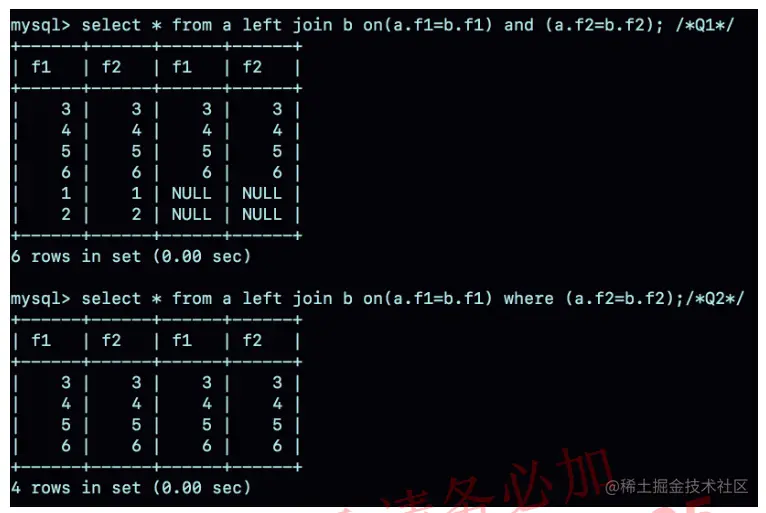 把这两条语句分别记为 Q1 和 Q2。首先,需要说明的是,这两个 left join 语句的语义逻辑并不相同。我们先来看一下它们的执行结果。