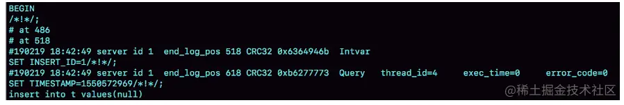 可以看到,在 insert 语句之前,还有一句 SET INSERT_ID=1。这条命令的意思是,这个线程里下一次需要用到自增值的时候,不论当前表的自增值是多少,固定用 1 这个值。这个 SET INSERT_ID 语句是固定跟在 insert 语句之前的,比如 @帽子掉了同学提到的场景,主库上语句 A 的 id 是 1,语句 B 的 id 是 2,但是写入 binlog 的顺序先 B 后 A,那么 binlog 就变成: