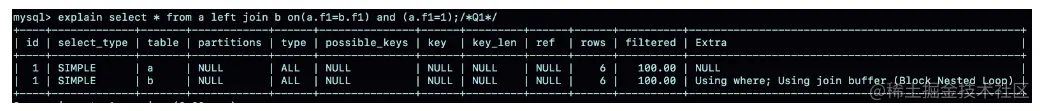由于表 b 的 f1 字段上没有索引,所以使用的是 Block Nexted Loop Join(简称 BNL)算法。