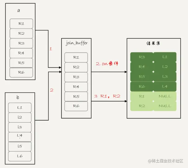 - 表 b 扫描完成后,对于没有被匹配的表 a 的行(在这个例子中就是 (1,1)、(2,2) 这两行),把剩余字段补上 NULL,再放入结果集中。