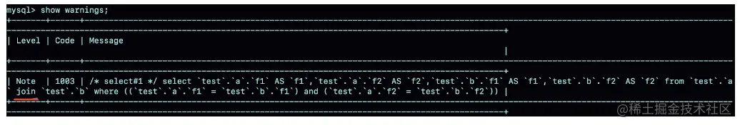 因此,优化器就把这条语句的 left join 改写成了 join,然后因为表 a 的 f1 上有索引,就把表 b 作为驱动表,这样就可以用上 NLJ 算法。在执行 explain 之后,你再执行 showwarnings,就能看到这个改写的结果,如图 5 所示。