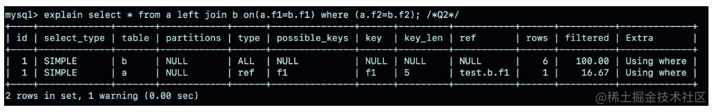 因此,语句 Q2 里面 where a.f2=b.f2 就表示,查询结果里面不会包含 b.f2 是 NULL 的行,这样这个 left join 的语义就是“找到这两个表里面,f1、f2 对应相同的行。对于表 a中存在,而表 b 中匹配不到的行,就放弃。这样,这条语句虽然用的是 left join,但是语义跟 join 是一致的。
