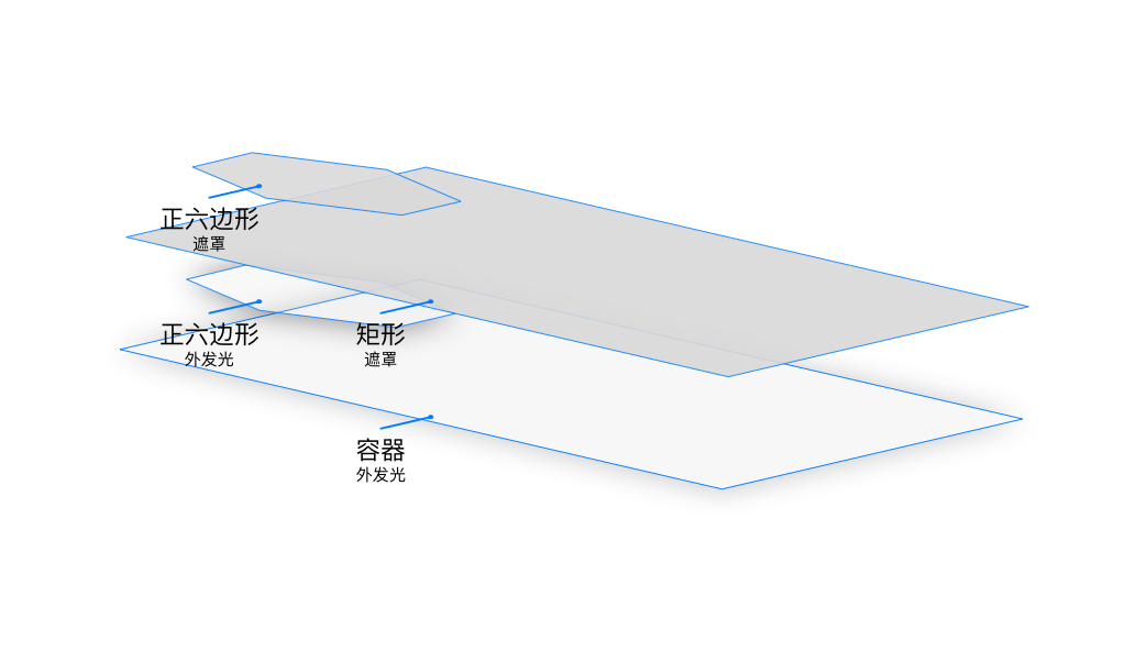 正六边形的外发光效果进入了矩形内,与设计稿不符。所以我们需要一个遮罩去当着进入到矩形范围内到发光效果,如下图所示: