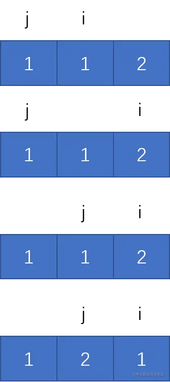 因为我们的目标是获取一个没有重复元素的数组,所以事情就很简单了,定义两个指针: j 和 i ,我们循环数组,开始移动 i ,只要发现 j 和 i 指向的元素不相同,就把 i 赋值给 j ,然后 ++j 后继续循环,直到循环结束。