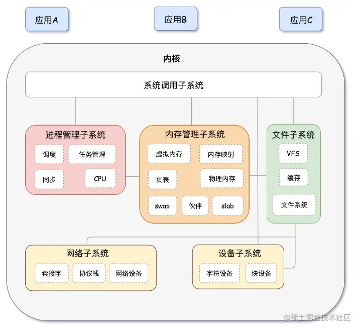 有时候,Glibc 一个单独的 API 可能调用多个系统调用,比如说,Glibc 提供的 printf 函数就会调用如 sys_open、sys_mmap、sys_write、sys_close 等等系统调用。也有时候,多个 API 也可能只对应同一个系统调用,如 Glibc 下实现的 malloc、calloc、free 等函数用来分配和释放内存,都利用了内核的 sys_brk 的系统调用。