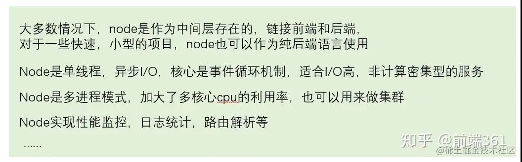 关于 node 的使用已经很久了,使用范围也很广,似乎有前端的地方就有 node,那么来思考一个问题,node 到底是用来干嘛的呢?本文从五个大的方面对该问题进行了解释。本文不仅仅可以应用场景的分析,完全可以把它当做Node.js高级进阶当路线,看看那些你还需要学。