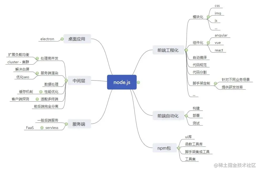 我们知道 node 的出现,让前端开发既 ajax 之后,有了全新的面貌,在开发效率,性能等层面都有质的提升。归纳一直是知识提升的重要一环,参考了很多内容,本文对 node 的应用做了一个入门级的总结。读完本文,希望可以清楚地认识到 node 在大前端中的地位和应用。