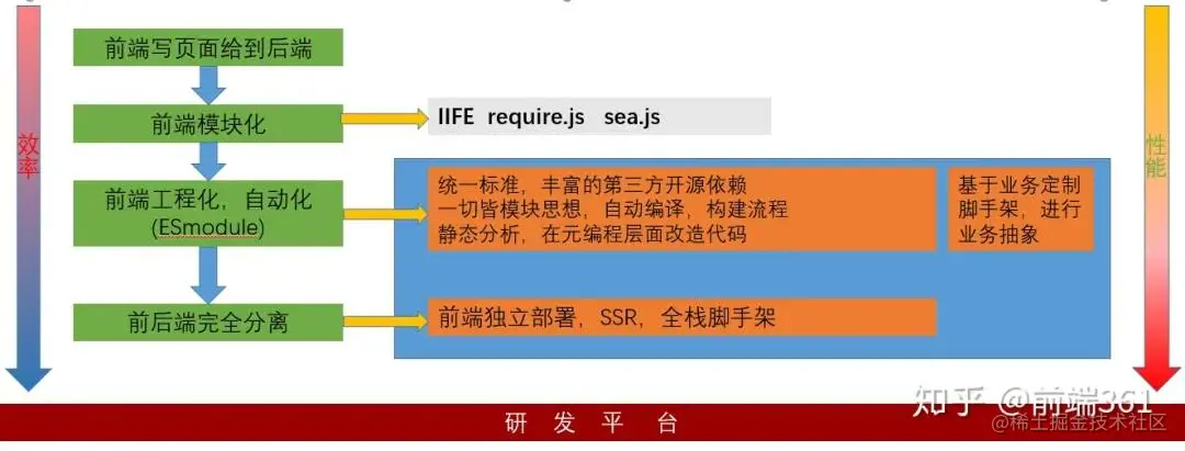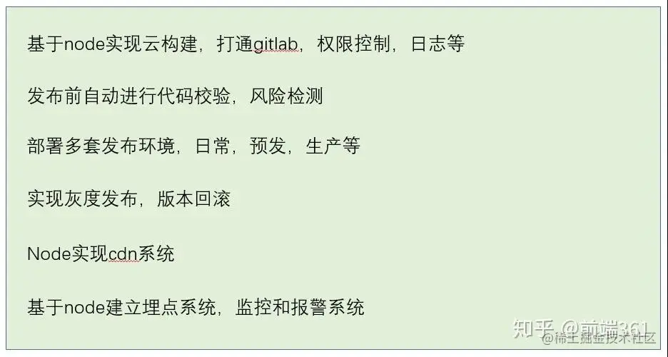 前端环境的建立是 node.js 在前端开发工作中最能体现价值的应用之一,node 的出现使得前端开发从刀耕火种的时代进入了科技时代。前端工程化依赖于前面提到的 webpack,gulp,babel,eslint 等,完整的脚手架体系除了客户端能力,还包括自动构建(比如jenkins),命令行发布的功能