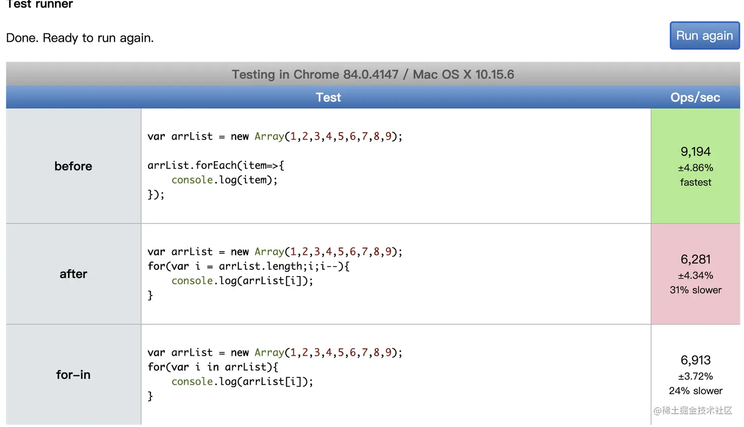 如下对比结果forEach循环是最优的,然后是for循环而for..in..是最差的