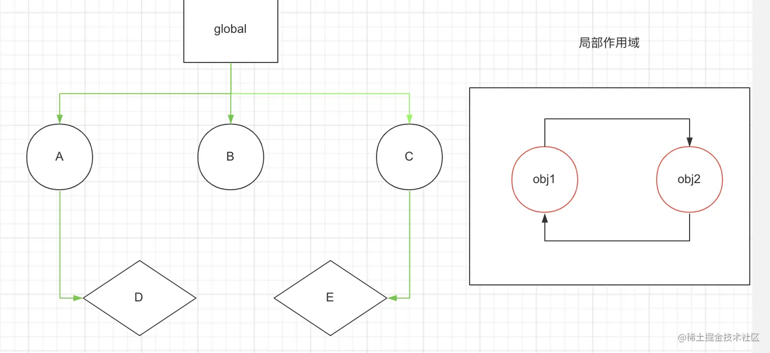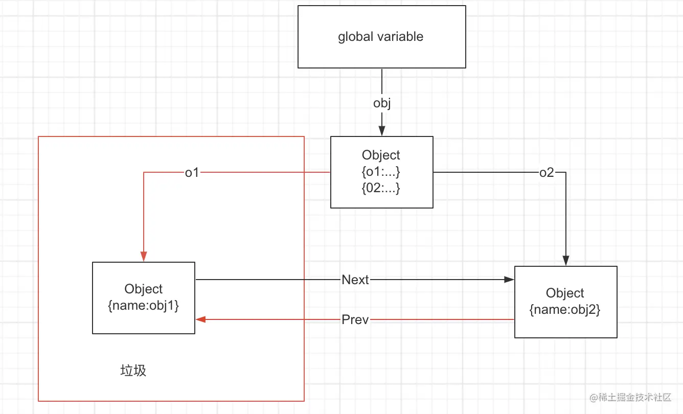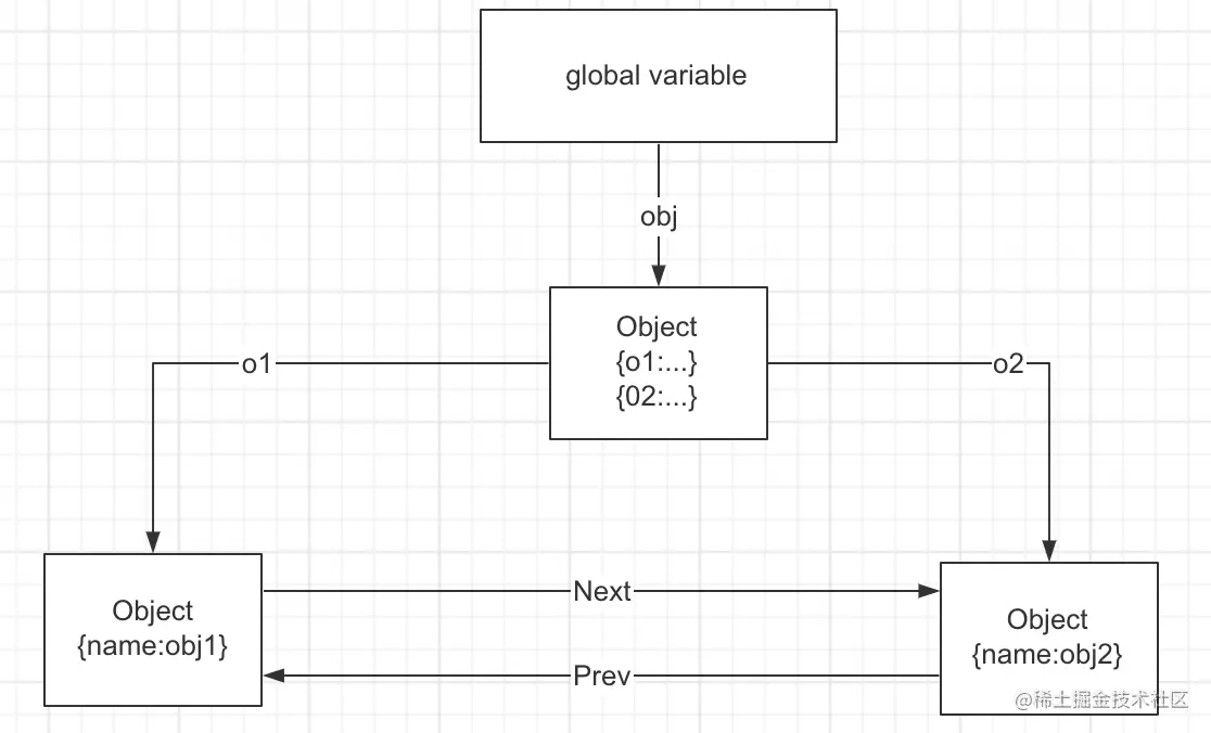 上述代码可以用下图来表示,全局找到一个可达的对象obj 然后返回了o1 和 o2 而o1 和 o2 是互相指向的,下面的都是可达的对象