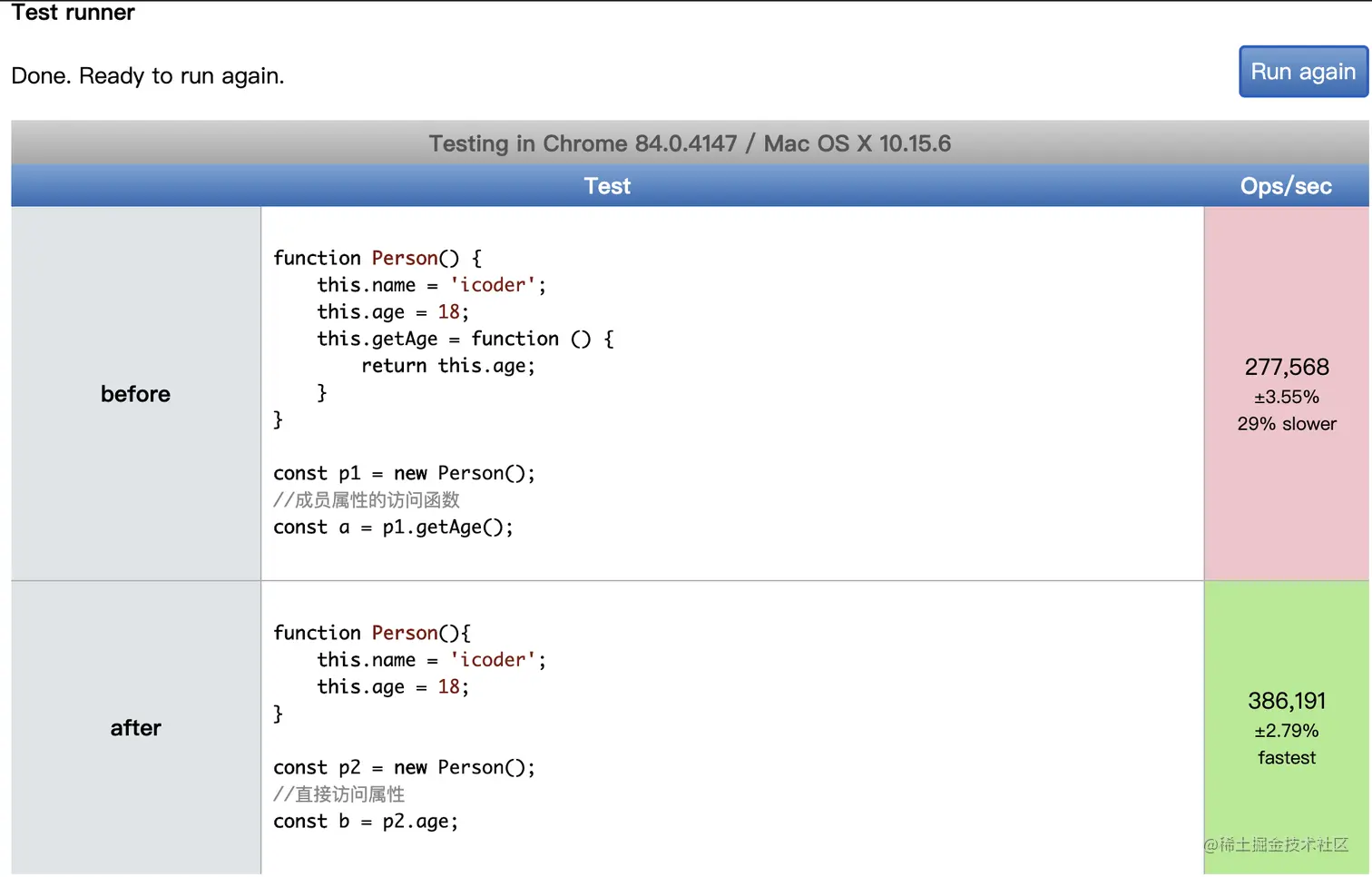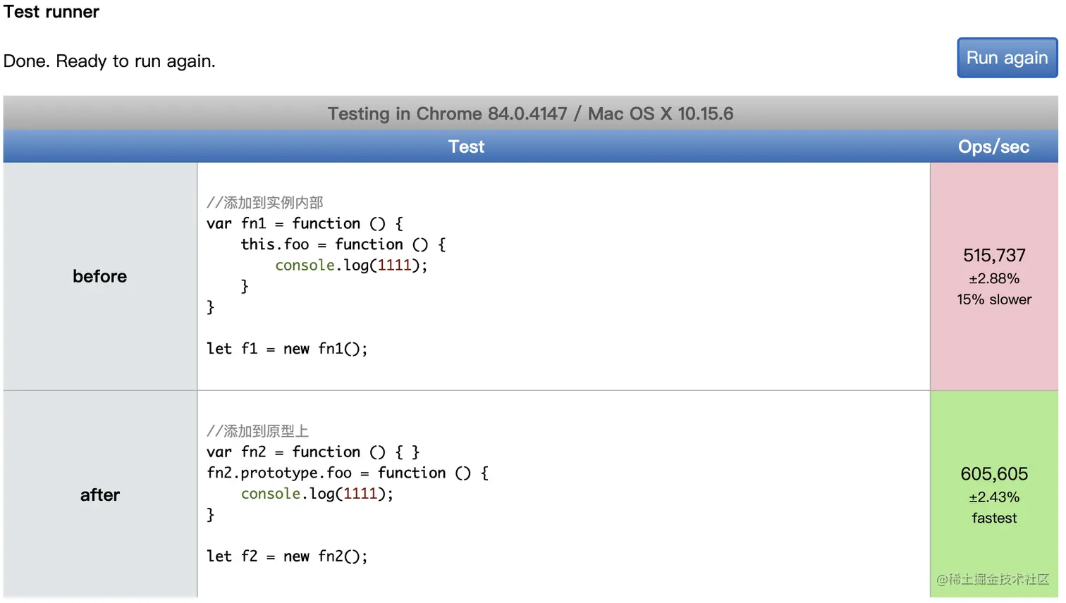 在jsperf上添加两种方式测试代码,进行性能对比,性能上在原型对象上添加方法性能要更好