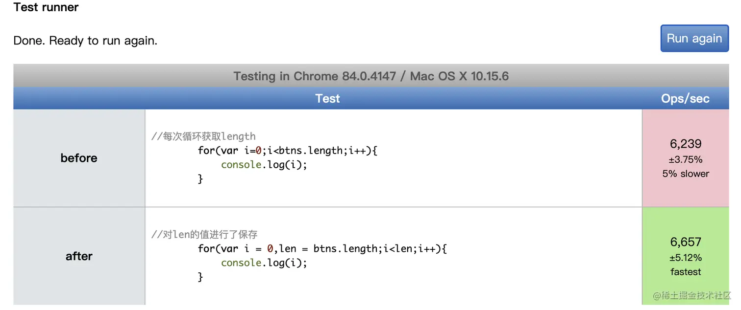 如下示例代码:主要进行了两个for循环的对比,第一个for循环每次循环获取length,第二个for循环对length进行了保存。