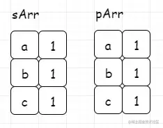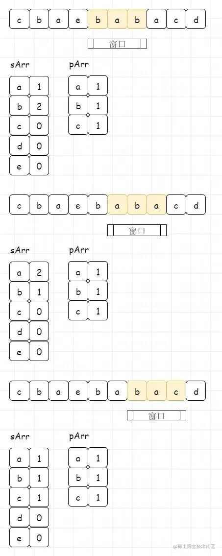 pArr为目标串数组,sArr为窗口数组。我们发现初始化数组,本身就满足,记录下来。(这里图示用map模拟数组,便于理解)