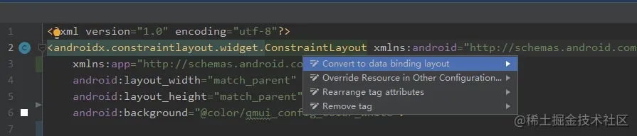 2.在列表中配合BaseQuickAdapter使用Databinding绑定数据,RecyclerView的item布局先写好,然后在这个布局的最外层的布局使用快捷键Alt+Enter就会出现这个提示框,选第一个就会自动生成一个data代码块,在这个代码块中,我添加了item所对应的数据实体,就是type对应的那个地址。