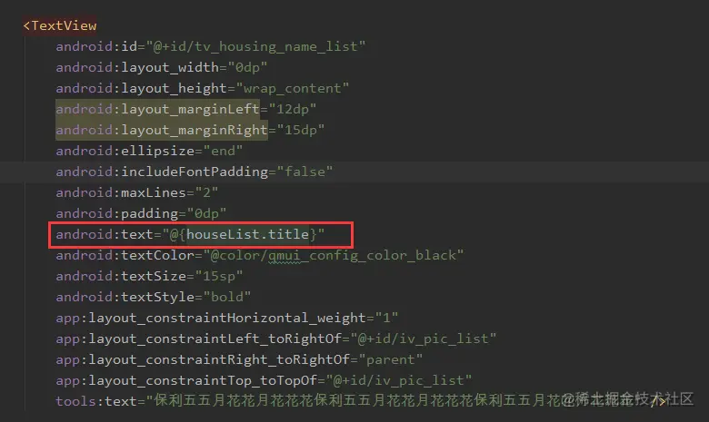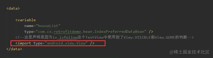是否关注的标签部分 就包含一个三元运算判断该标签是否展示,这里要注意的是需要再data外层的data代码中添加声明: 才能使用View.VISIBLE