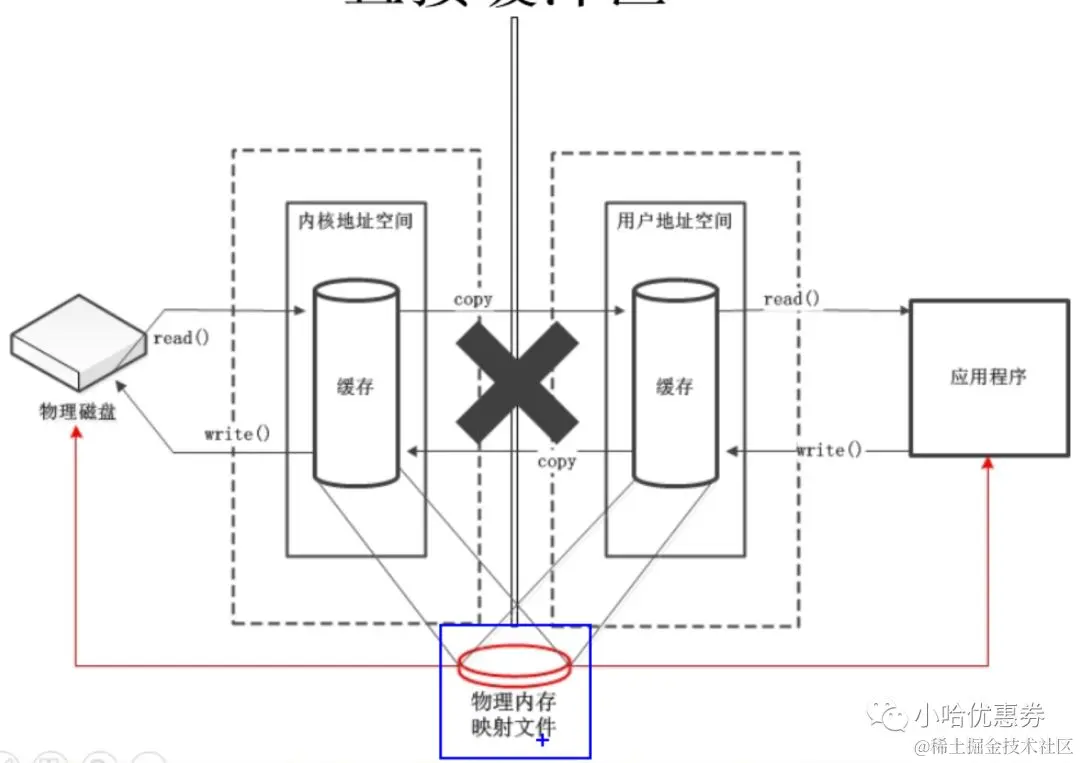 NIO: 磁盘--》物理内存映射文件--》应用程序, 减少了1次拷贝。