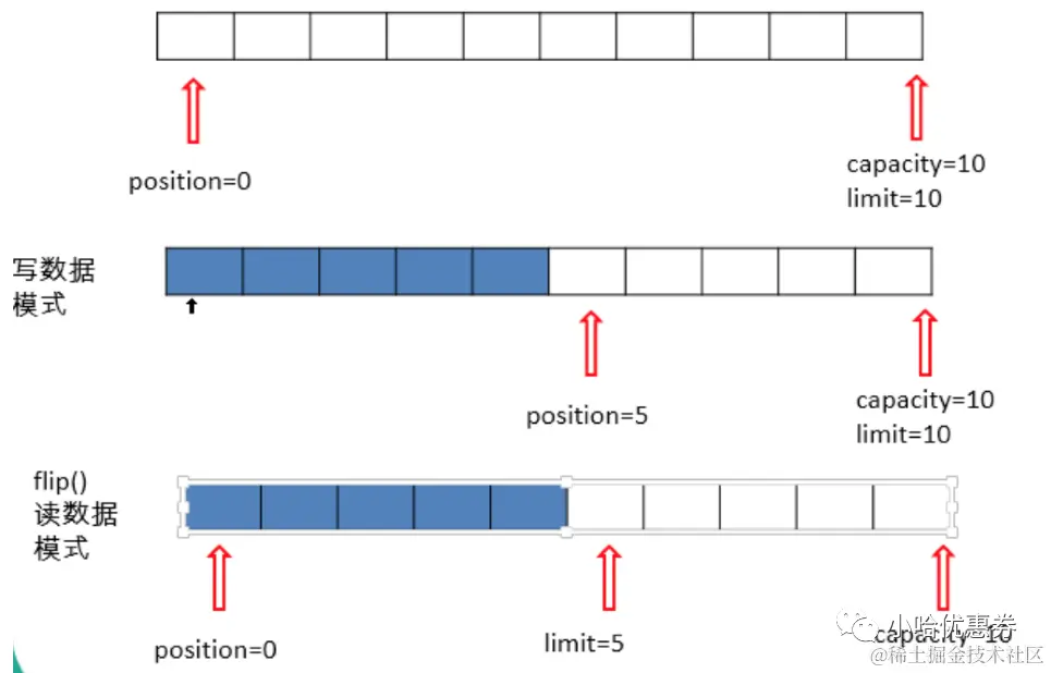 position表示当前指针位置。当读取数据的时候,需要调用flip()方法设置position的位置,才能读取数据