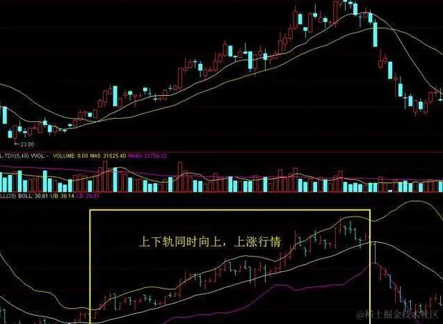 1、上下轨同时向上,这种情况,股价一般游走在中轨和上轨之间,为上涨行情。