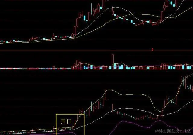 4、上轨向上,下轨向下,呈开口形态,这种情况一般属于股价向上拉升或者急跌阶段,此时阻力线和支撑线打开,称为“开口”。