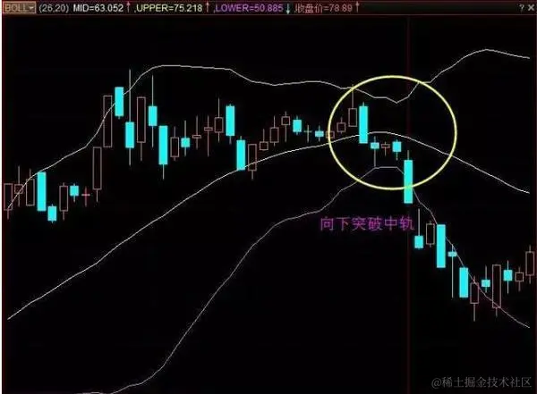 3、当K线从布林线中轨上方、向下突破的中轨时,预示着股价前期的强势行情已经结束,股价的中期下跌趋势已经形成,投资者应及时卖出。