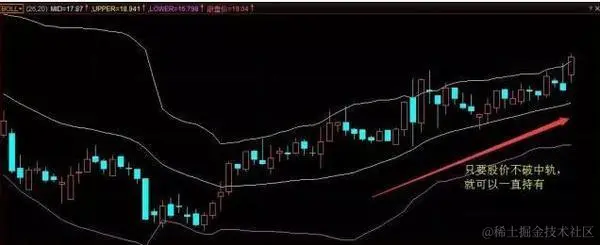 2、当K线一直处于中轨线上方,并和中轨线一起向上运动时,表明股价处于强势上涨过程中,只要K线不跌破中轨线,投资者坚决一路持股。