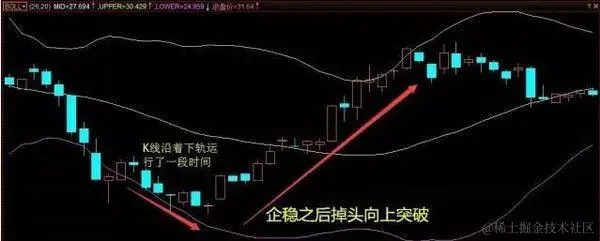 1、当K线在布林线下轨运行了一段时间后,如果K线的运动方向有掉头向上的迹象时,表明股价短期内将止跌企稳,投资者可以少量逢低建仓。