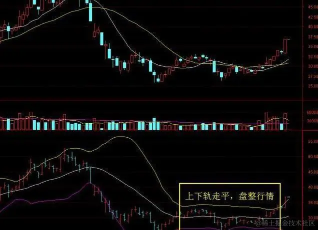 2、上下轨接近走平,这种情况,股价一般在中轨上下震荡,多为盘整行情。