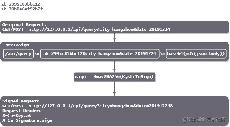 同样的,服务端获取到请求的 ak 后,查询出对应的 sk,使用相同的规则进行签名计算,计算出的 sign 和传入的 sign 比对,就能够知道参数是否被篡改。