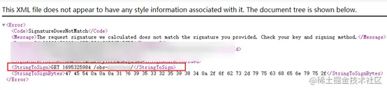 如下图是服务端返回的由接收到HTTP请求所还原的StringToSign,您可以通过对比您本地的StringToSign和您发送到服务端的HTTP请求,来分析您签名计算失败的原因。