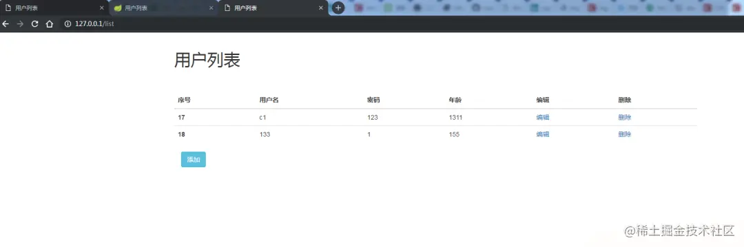 在完成Nginx配置之后,我们启动Nginx。linux输入/usr/local/nginx -c /usr/local/nginx/cinf/nginx.conf,如果已经启动可以使用/usr/local/nginx/sbin/nginx -s reload命令进行热加载配置文件,Windows直接点击Nginx目录下的ngix.exe或者cmd运行start nginx进行启动,如果启动了依旧可以使用nginx -s reload进行热加载。Nginx启动完成之后,我们依次启动刚刚下载的springboot和复制更改端口的项目,输入:java -jar springboot-jap-thymeleaf.jar启动。都启动成功之后,我们在浏览器输入服务的ip即可进行访问。示例图: