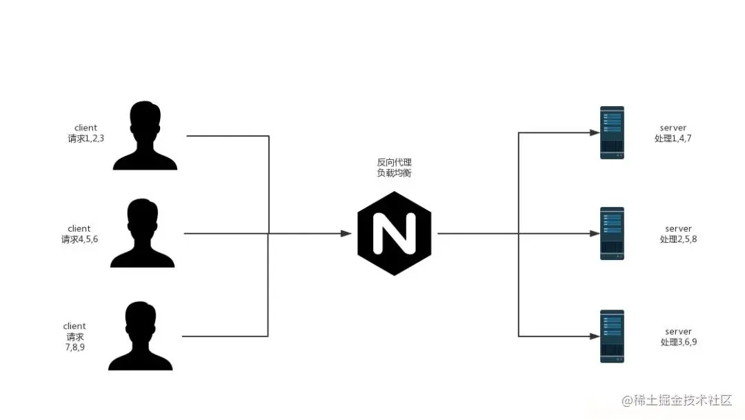 简单来说所谓的负载均衡就是把很多请求进行分流,将他们分配到不同的服务器去处理。比如我有3个服务器,分别为A、B、C,然后使用Nginx进行负载均衡,使用轮询策略,此时如果收到了9个请求,那么会均匀的将这9个请求分发给A、B、Cf服务器,每一个服务器处理3个请求,这样的话我们可以利用多台机器集群的特性减少单个服务器的压力。