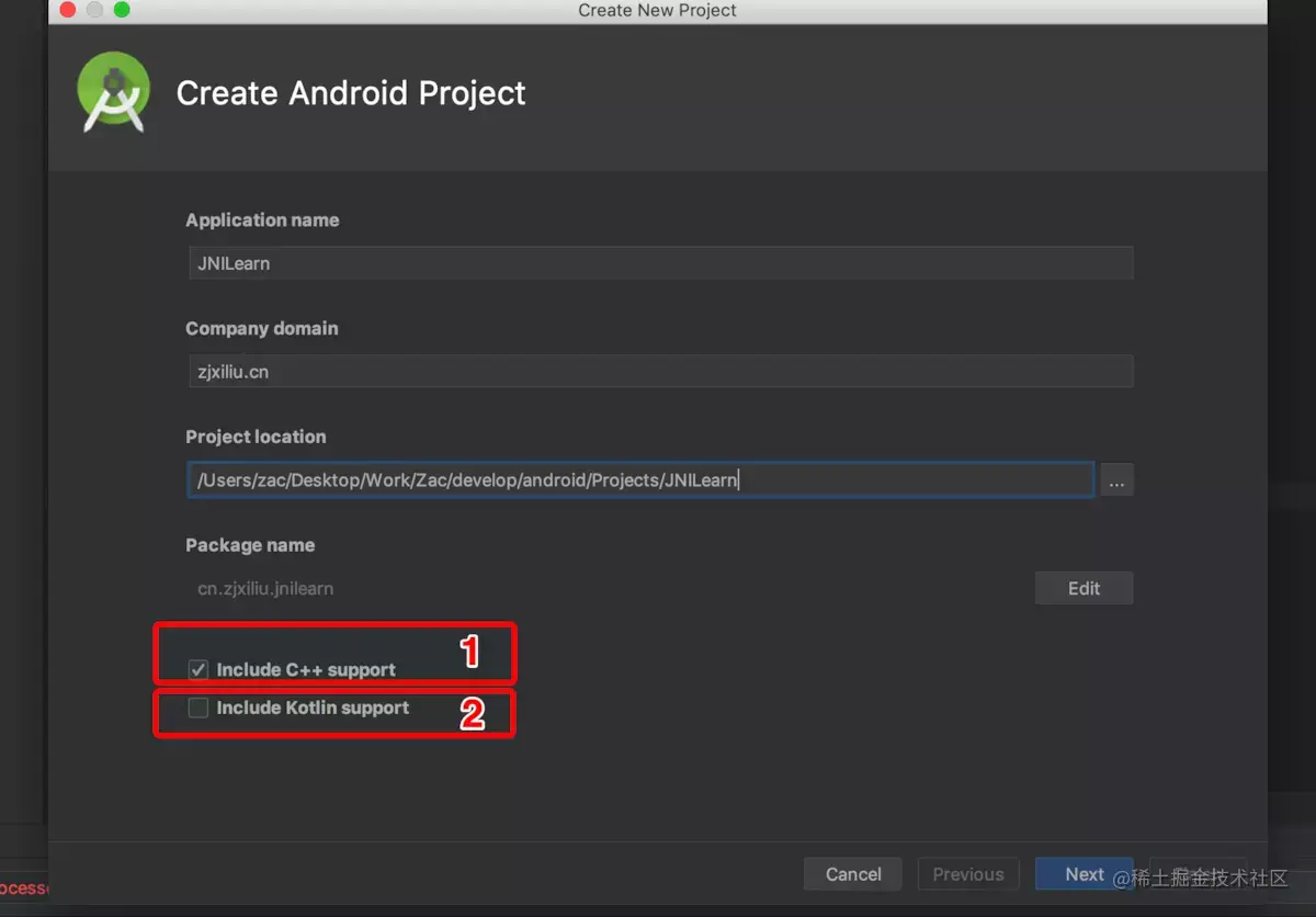 如上图所示,当创建项目时,会出现<1><2>两个选项,因为要做NDK开发,所以<1>需要进行勾选处理,然后点击Next按钮