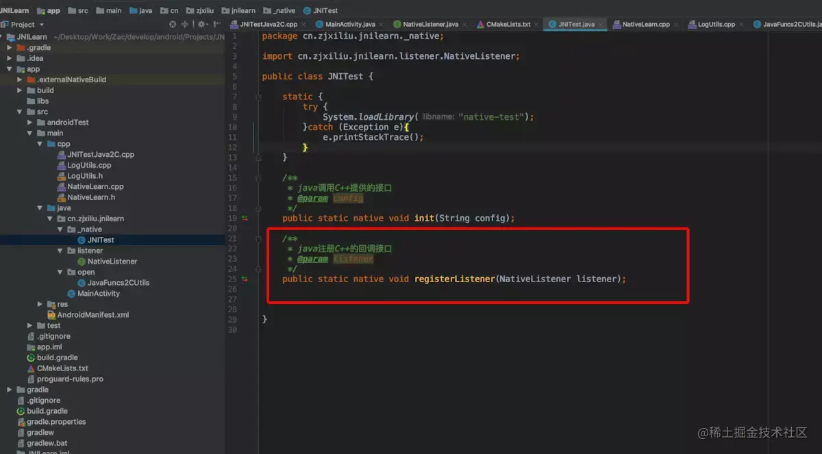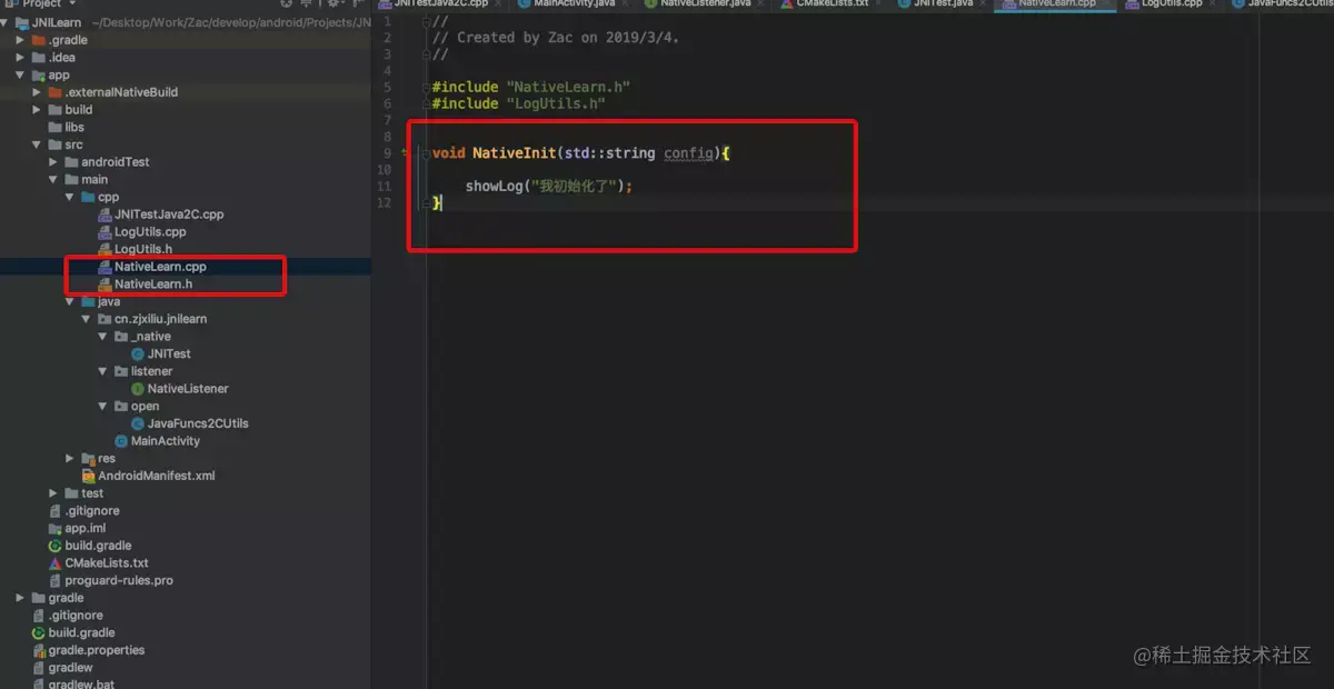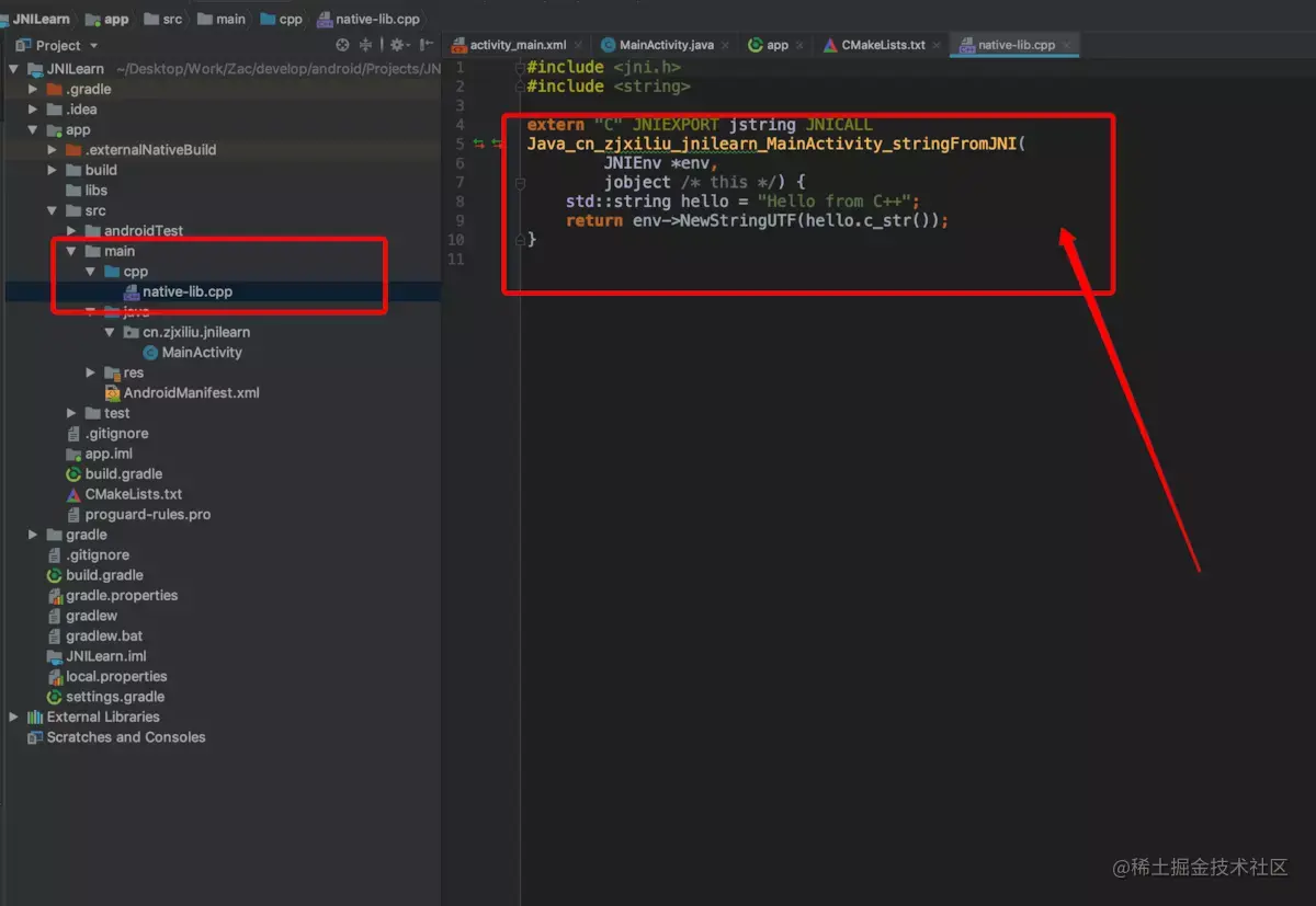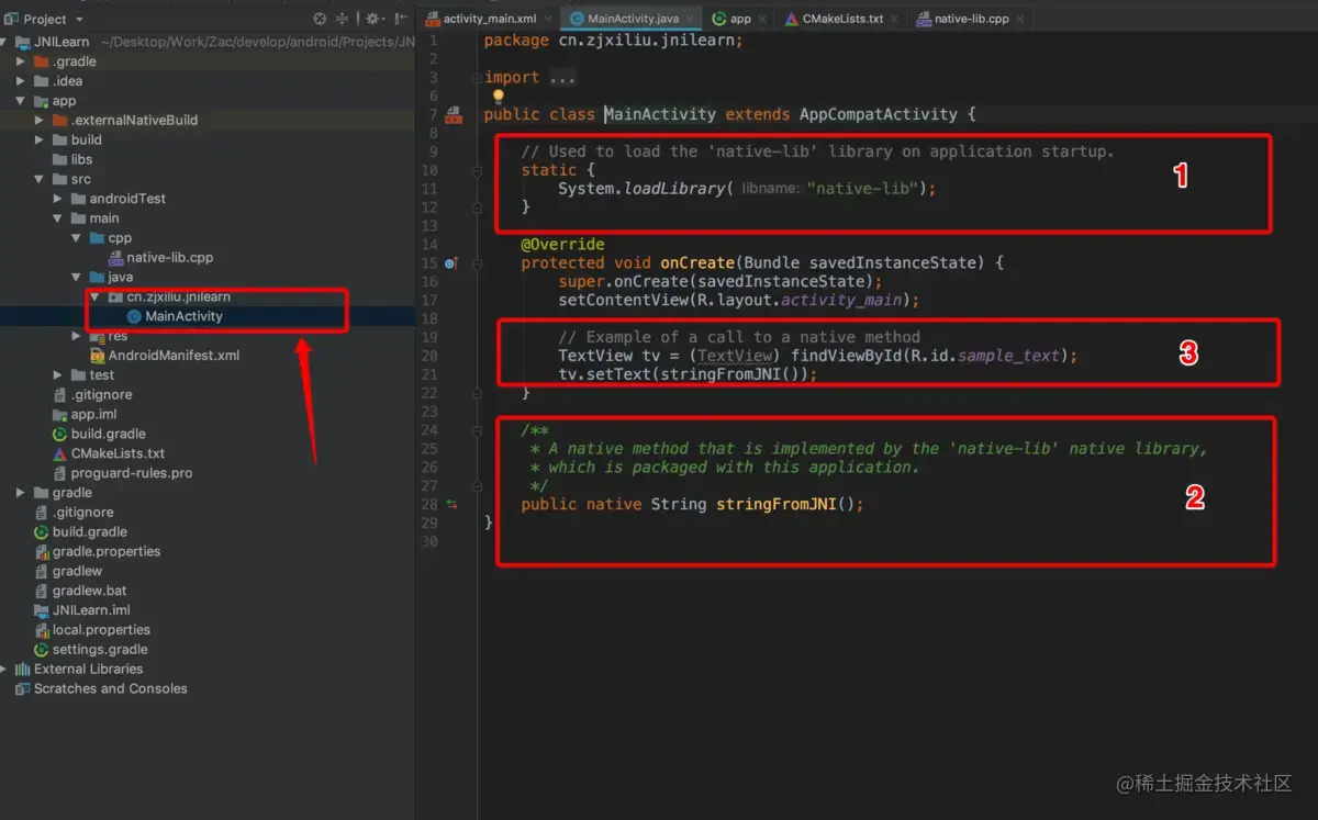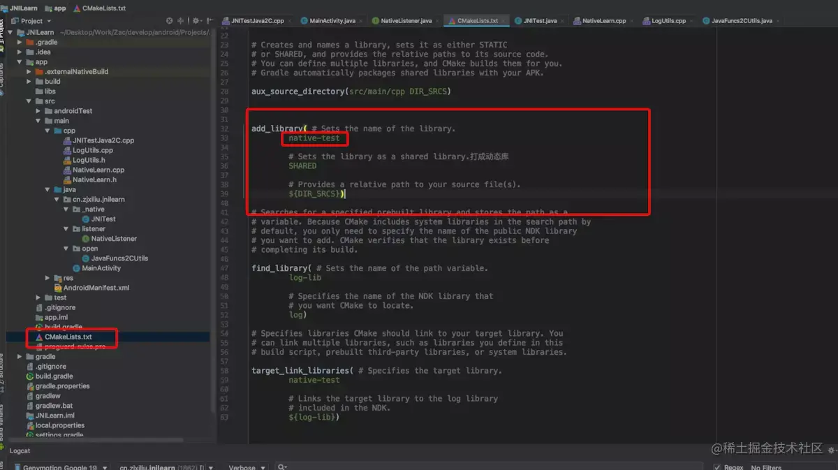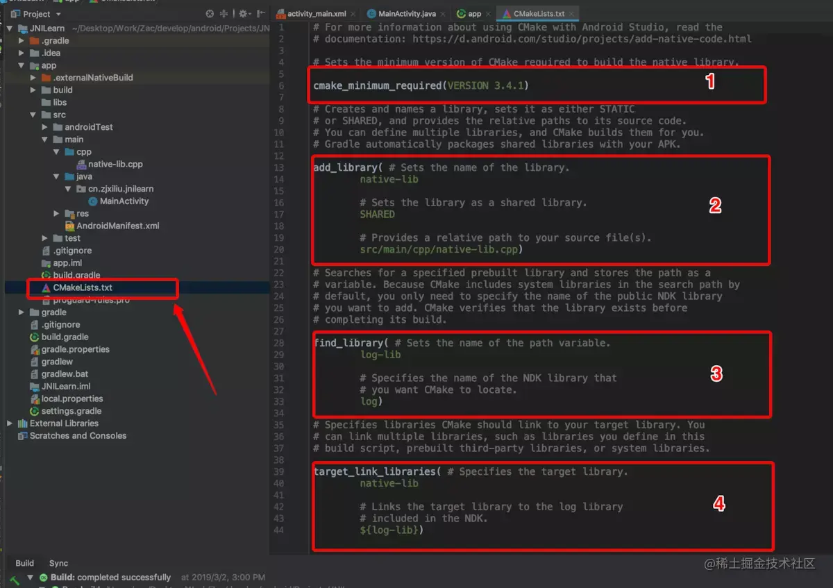 AS在我们创建C++支持的项目时,会自动帮我们创建一个案例,生成一个叫native-lib动态库,关于CMake的命令行以及CMakelists文件的编辑,可以查看网上的教程
