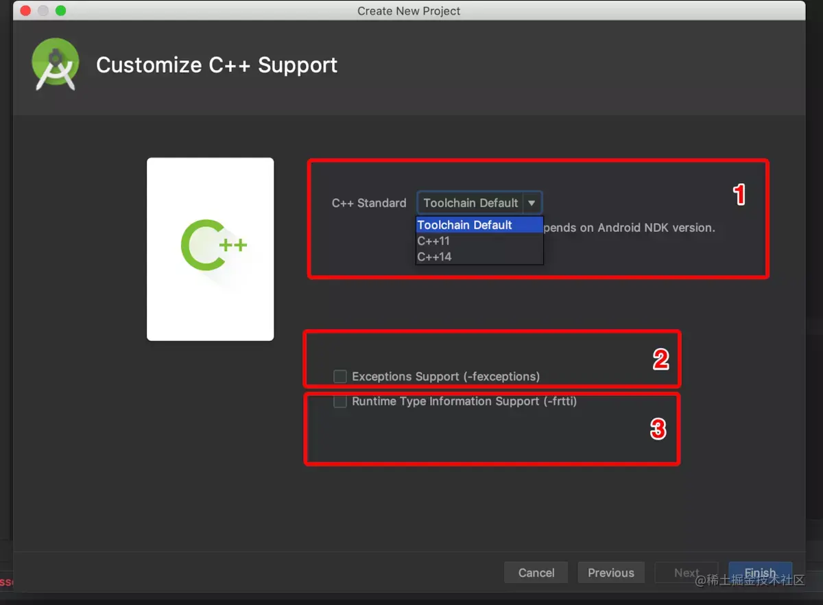 Exceptions Support 如果选中复选框,则表示当前项目支持C++异常处理,如果支持,在项目Module级别的build.gradle文件中会增加一个标识 -fexceptions到cppFlags属性中,并且在so库构建时,gradle会把该属性值传递给CMake进行构建。