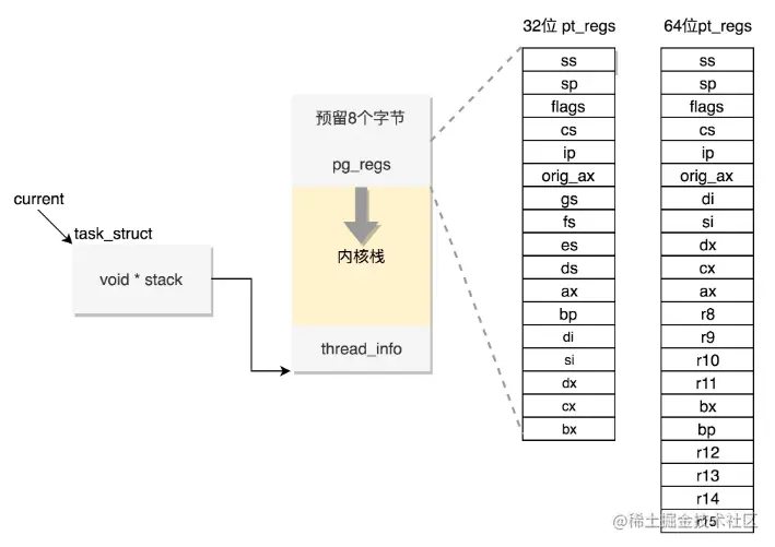 这段空间的最低位置,是一个 thread_info 结构。这个结构是对 task_struct 结构的补充。因为 task_struct 结构庞大但是通用,不同的体系结构就需要保存不同的东西,所以往往与体系结构有关的,都放在 thread_info 里面。