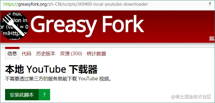 然后就是安装脚本工具,可以使用这个脚本工具:本地YouTube下载器。进入页面,直接点击“安装此脚本”,然后下载并安装完成就可以了。
