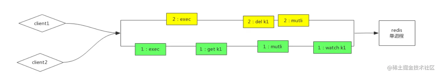 当事务执行时,哪个客户端的 EXEC 命令先到达就哪个先执行,如下图所示: