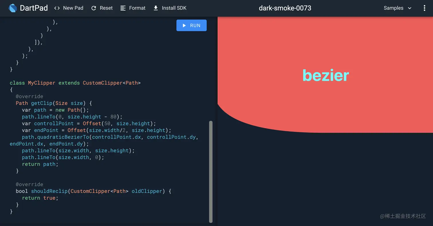 这是哪个点?是我们从原点直接向下👇走,走到离我们的Container高度还剩80处,我们要开始画贝塞尔曲线了!上面就说过,我们要画贝塞尔曲线,我们要传入两个点的坐标!是后面两个点!P1和P2,自己定义两个呗。定义好以后我们调用path自带绘制贝塞尔方法试试🖼。