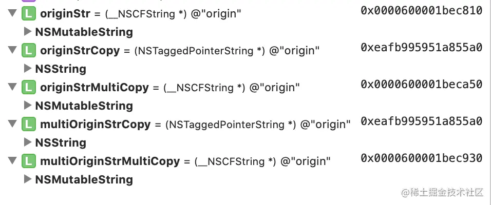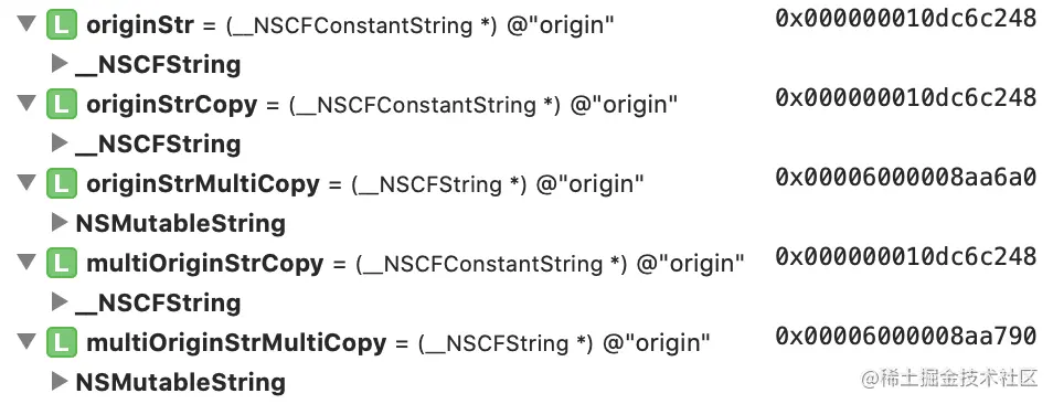 先看前三个对象:发现无论是 copy 生 成originStrCopy 还是 mutableCopy 生成的 originStrMultiCopy,与 originStr的内存均不同,这说明什么?