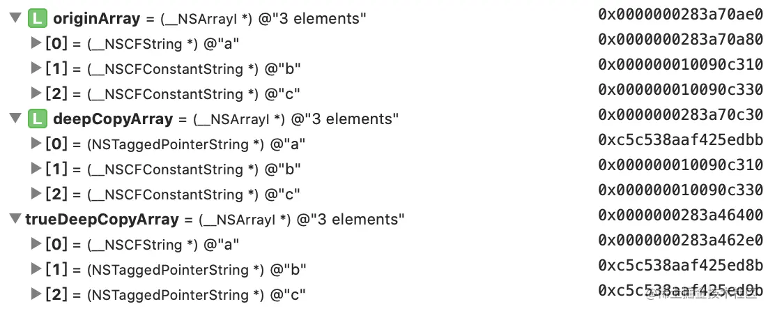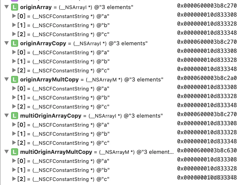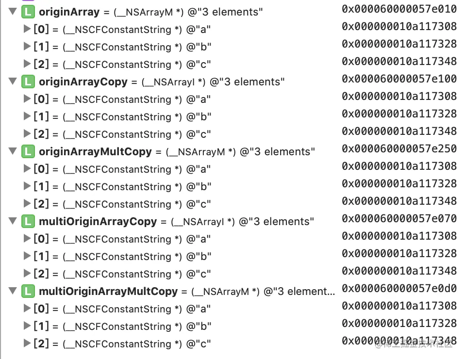 详细看上图的originArray 和 originArrayCopy 及 originArrayMultCopy 三个对象的地址,originArray地址0x0000600003b8c270,originArrayCopy地址0x0000600003b8c270,originArrayMultCopy地址0x0000600003b8c2a0。
