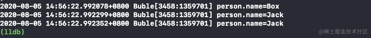 再次运行,可以发现 person 地址和personCopy 地址不同,说明对于[person copy] 生成了一份全新的对象。