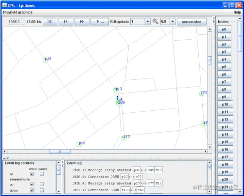 节点位置,当前路径和节点之间的连接,节点承载的消息数量等在主窗口显示。可以生成经过筛选的模拟事件日志,例如联系人和消息传输。过滤器用于进一步筛选检查。