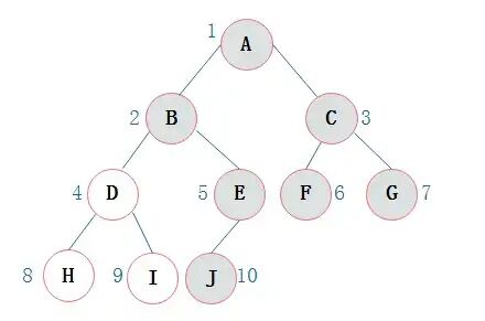 完全二叉树: 对一颗具有n个节点的二叉树按层编号,如果编号为i(1<=i<=n)的节点与同样深度的满二叉树中编号为i的节点在二叉树中位置完全相同,则这棵二叉树称为完全二叉树.如图: