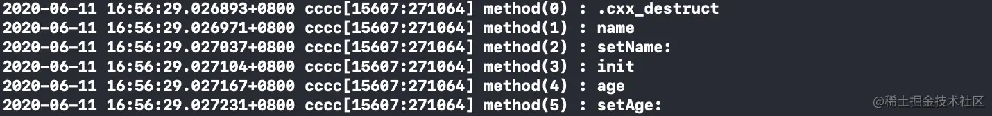 NSLog(@"method(%d) : %@",i,NSStringFromSelector(method_getName(method)));