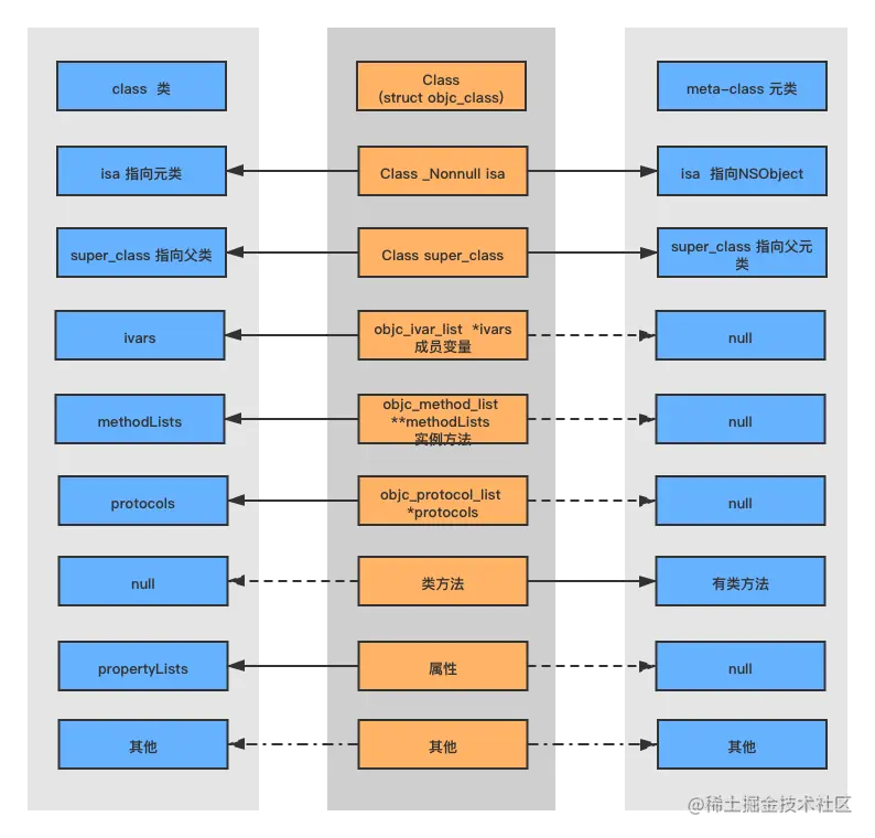 meta-class对象和class对象的内存结构是一样的,所以meta-class中也有类的属性信息,类的对象方法信息等成员变量,但是其中的值可能是空的。因为class和meta-class对象都可以通过object_getClass 获得,因此他们的类型都是一样的(同样的Class 这个机构体),都是typedef struct objc_class *Class这个 Class 类,可以理解,它们各自利用Class的一些“成员变量”来实现自己的功能。