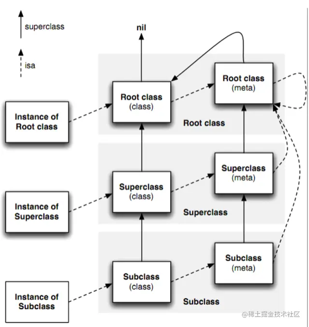 - 根元类的超类是NSObject,而isa指向了自己,而NSObject的超类为nil,也就是它没有超类。