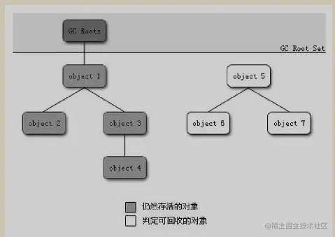 这个算法的思想是通过一系列成为GC Roots的对象作为起点,从这些节点开始向下搜索, 节点所走过的路径称之为引用链,当一个对象到GC Roots没有任何引用链相连的话,则证明该对象不可用。