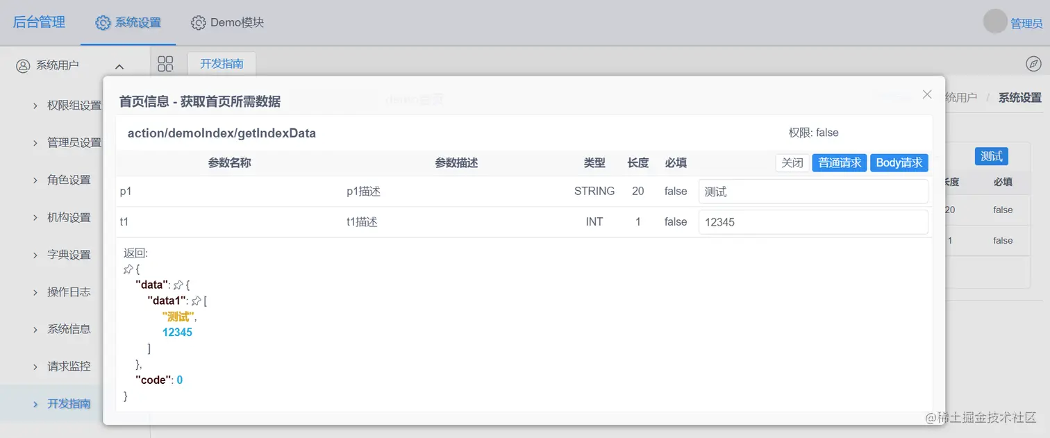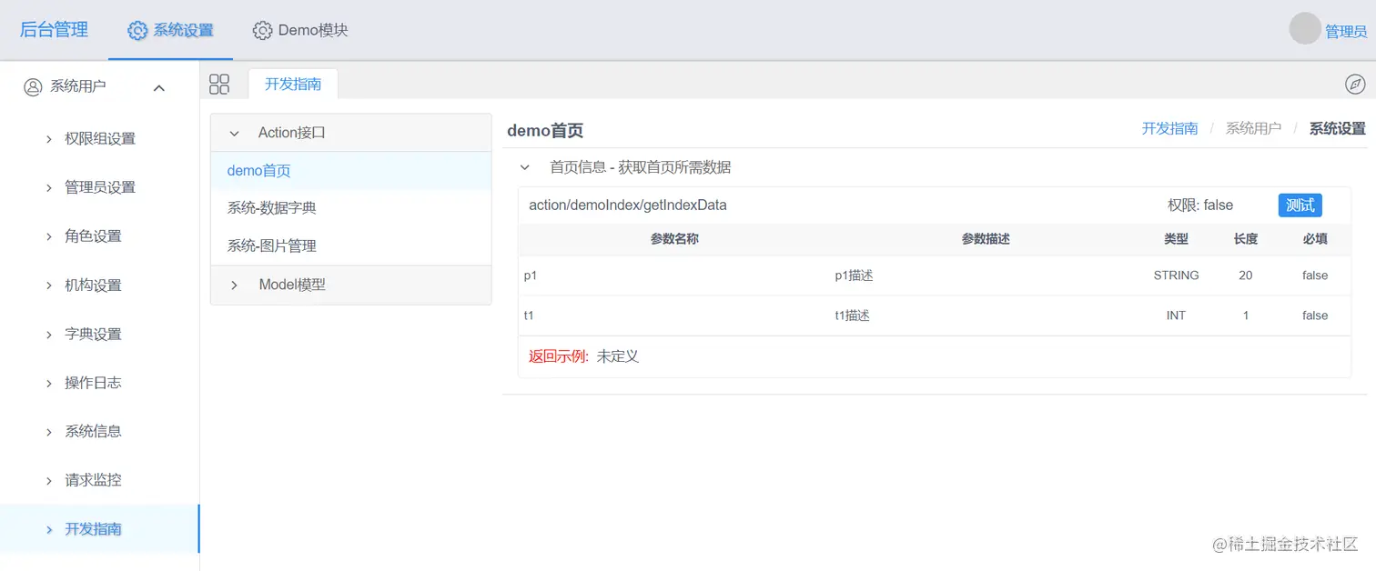 配置注解的方法将会在后台菜单的开发指南里显示,可进行调用。